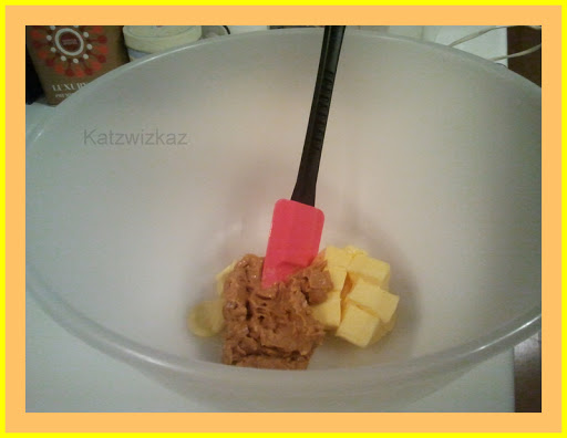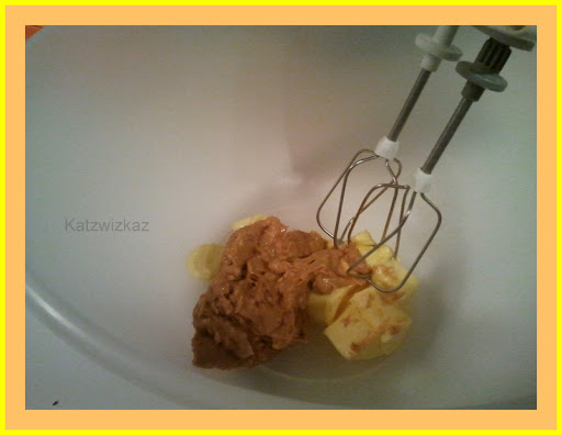 In a second bowl, combine the the peanut butter and ordinary butter together until it is soft. Then, add the sugar, egg & vanilla, combine, and finally add the flour (with baking powder), the chocolate and bring together to form a dough.