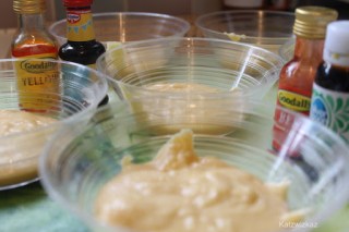 Now the next part of the recipe is a bit time-consuming. Lay out 6 bowls. Divide the cake batter equally into each one.