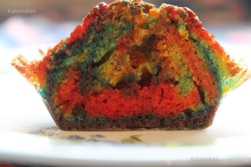 I can usually refer to the many, many baking books in my possession for inspiration, but today this was not the case. My daughter wanted Rainbow Cupcakes to take to a themed birthday party, and had found a recipe from an interesting site called Cut Out and Keep. There are other recipes for cupcakes in my blog, but it’s the ‘Rainbow’ effect in these which sets them apart.