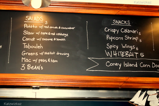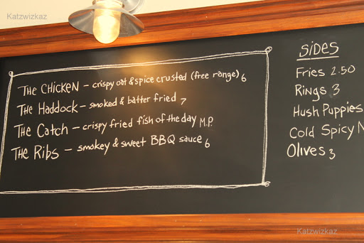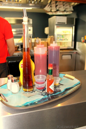 What you will find is fresh food, cooked properly, and strictly to order.  The “chips” are really good too, potatoes cut into fries and cooked with the skins on, and a nice selection of salads as sides.  Good old U.S. of A., naughty (but nice!) treats like Hush Puppies, and Coney Island Corn Dogs also feature.  The onion rings, which are a particular favourite of mine, have the lightest, crispiest coating I have ever had.  Customers can help themselves to a variety of seasonings available on the counter top.