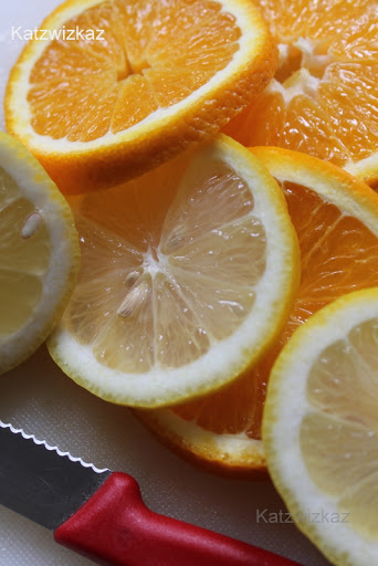 The original recipe included boiling orange and lemon slices in syrup to soften them, arranging fruit slices on the base of the tin, and then pouring the syrup over the base. After I cleaned up the mess which ensued, I did a bit of re-working, and came up with a much simpler version!