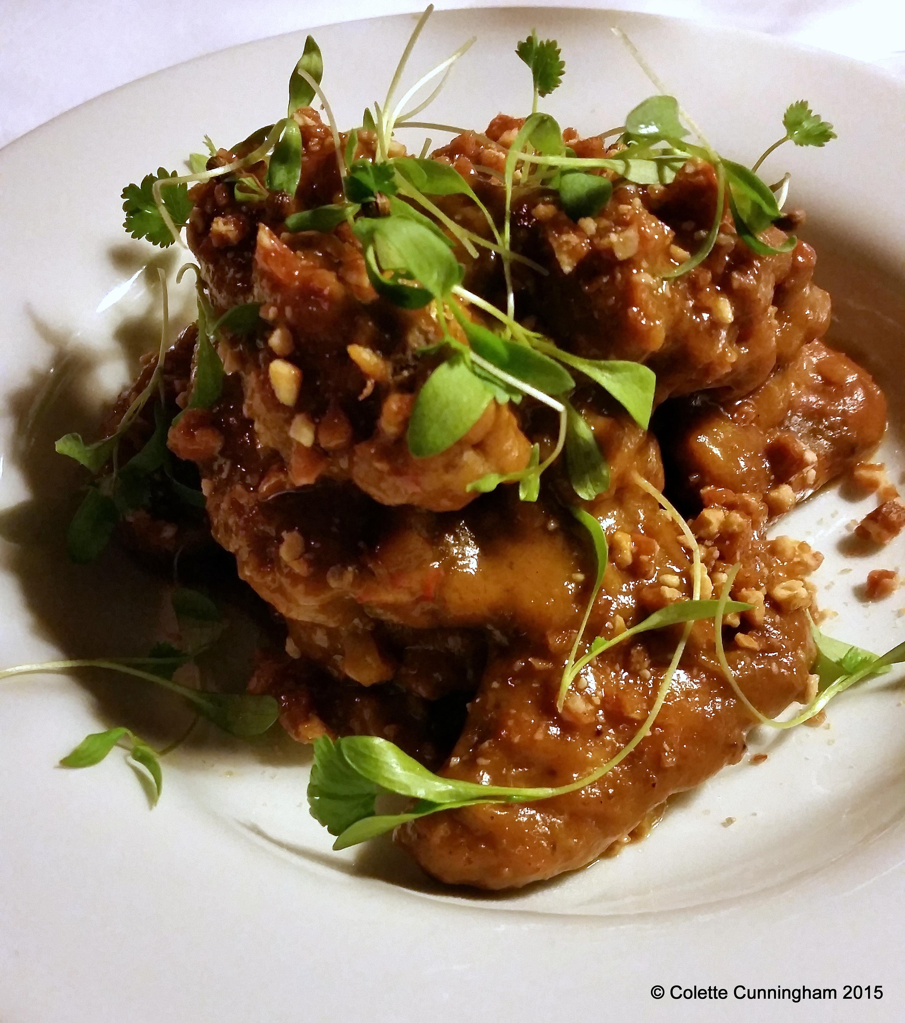 Amuse Bouche – (Sharing plate for our table) -Thai-style Chicken Wings with Peanut Brittle Satay Sauce.