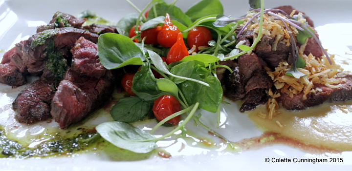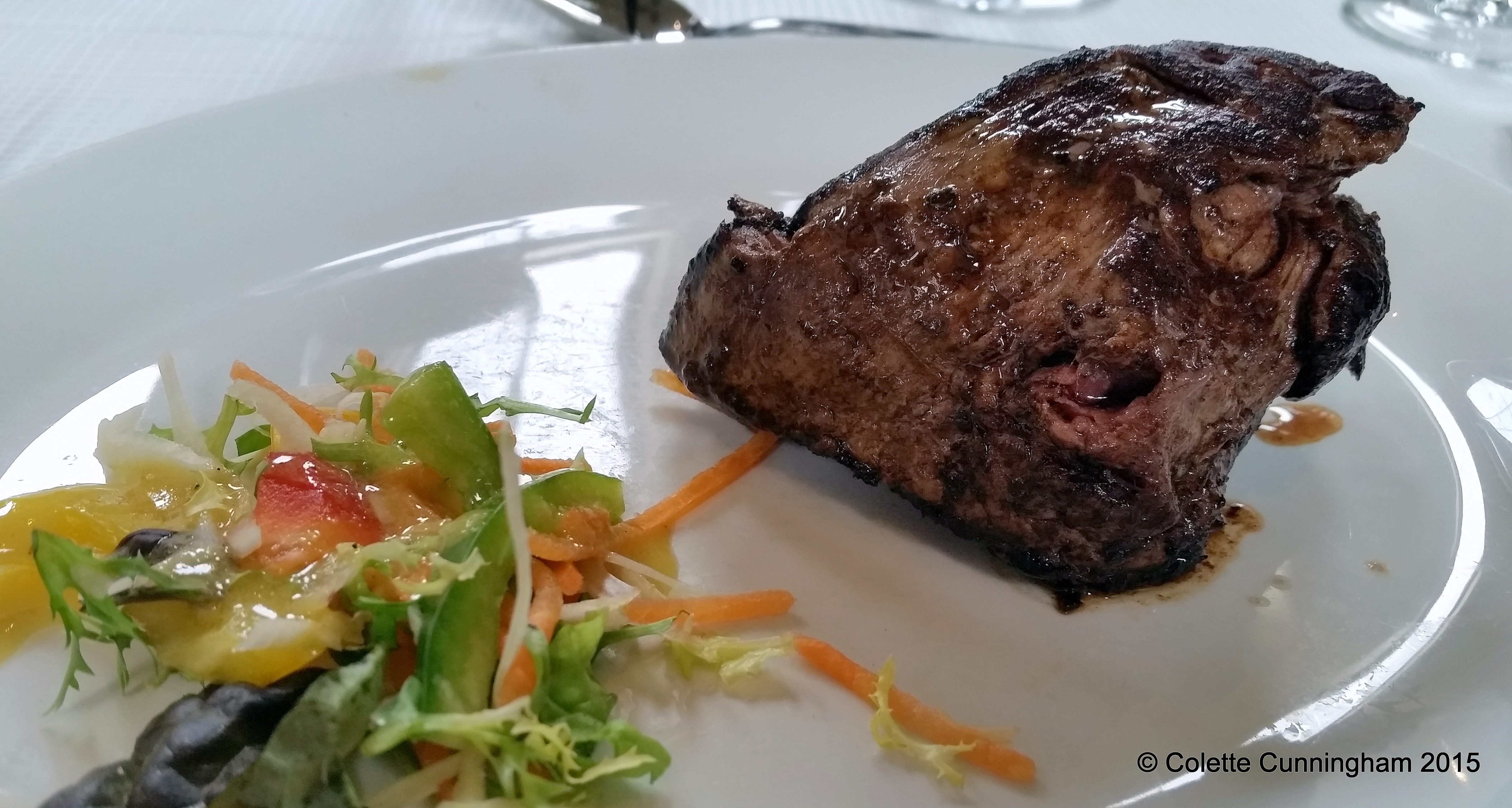 We returned from our walk to the conservatory, which is adjoining the Restaurant area, where we were shown two less well-known cuts of beef, and yet less expensive cuts – Feather Blade and Skirt. Chef Mark Fearn (La Rousse Foods) was on hand to talk us through the marinading and cooking of the meat.  “Low and Slow, or Flash-Fry”, that is how to treat these delicious pieces of meat.  We were also treated to a wine pairing and tasting (which I found fascinating) given by Mr. David Patton, and our own choice of steaks for dinner.