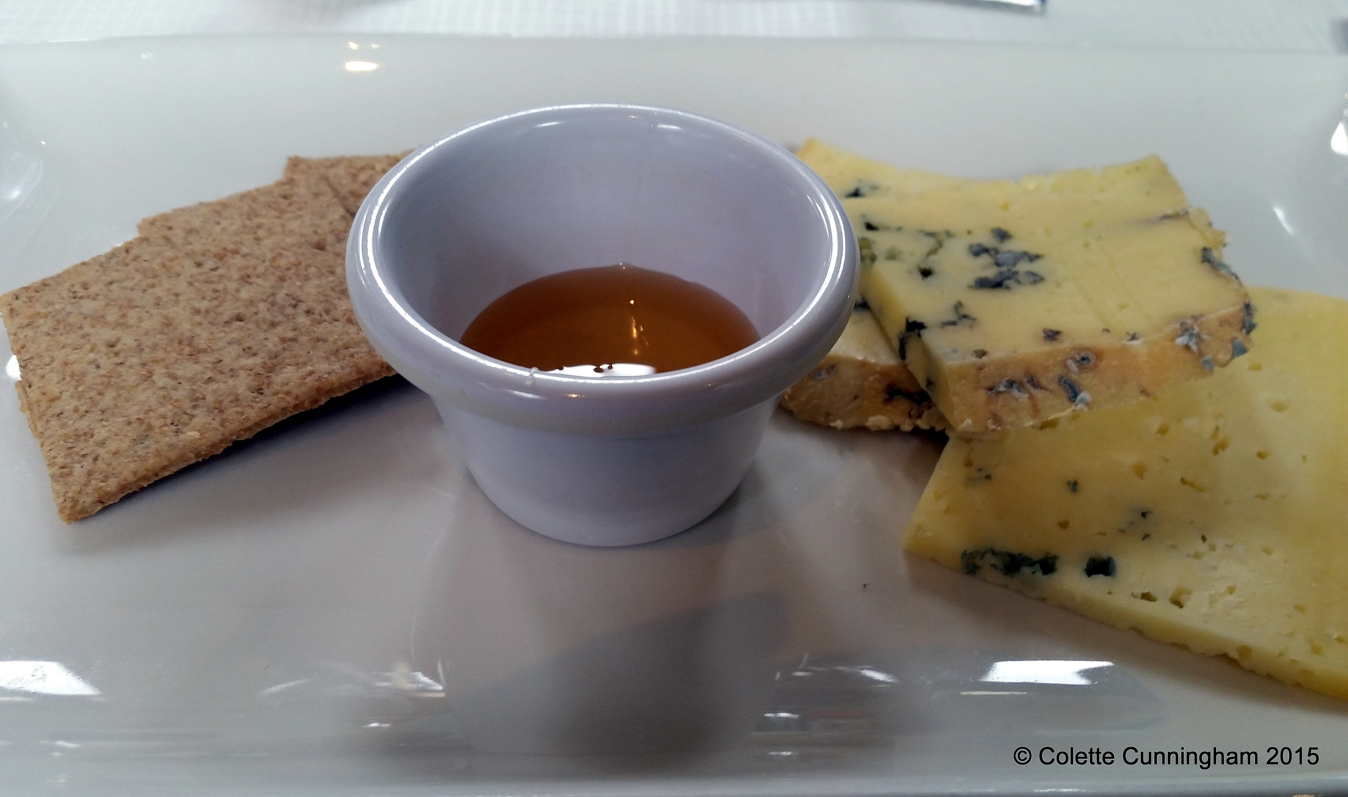 Bellingham Blue Cheese (Castlebellingham), served with Lannléire Honey (Dunleer) and Sheridan’s Brown Bread Crackers completed our meal, which was paired with a Dessert Sherry, (Barbadillo La Cilla Pedro Ximenez), rather than Port.  The over-riding flavour was that of raisins, which was a perfect and surprising match for the locally-made Cheese and Honey.