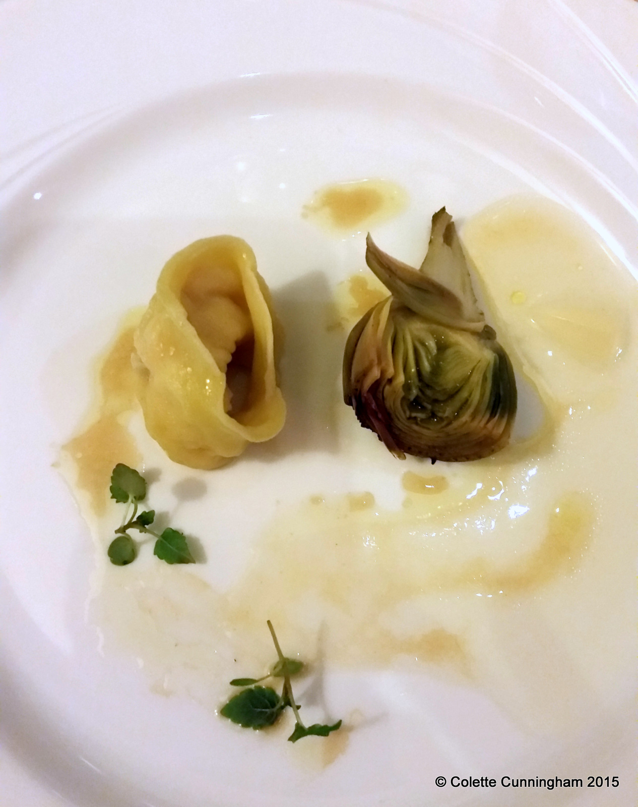 Chef’s Amuse Bouche – Tortelloni of salted cod and Irish lobster, baby artichoke, and lemon jelly